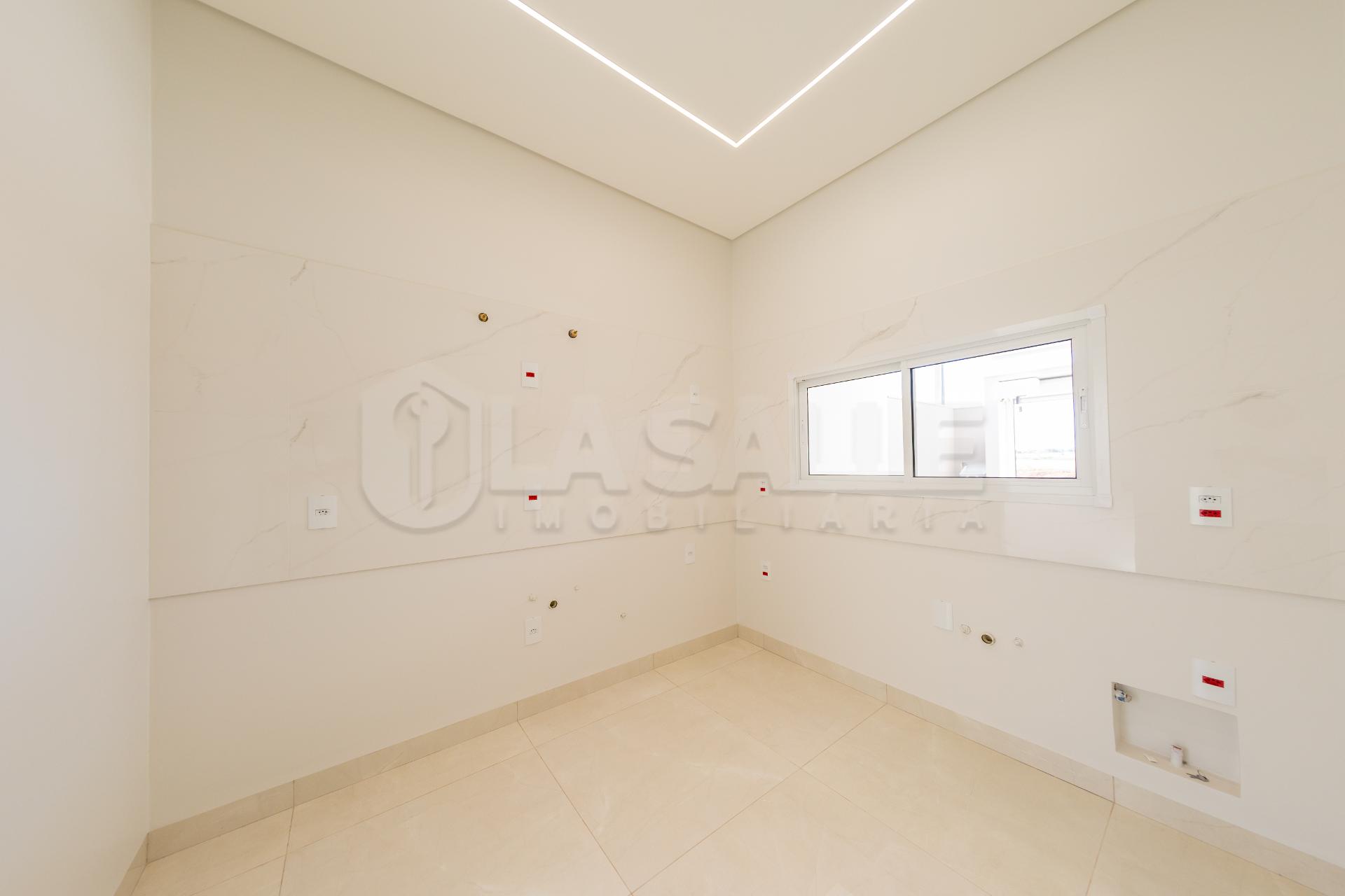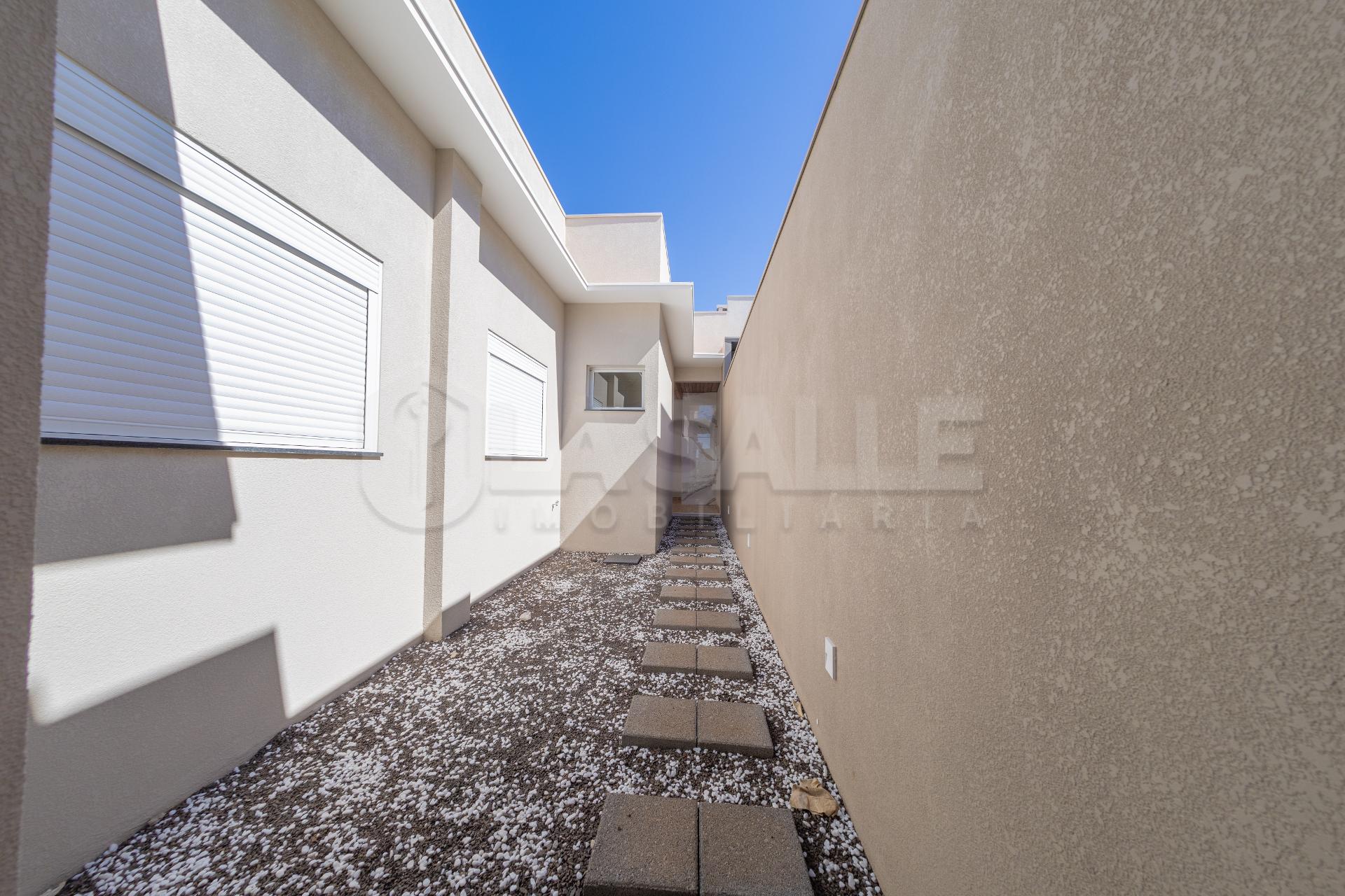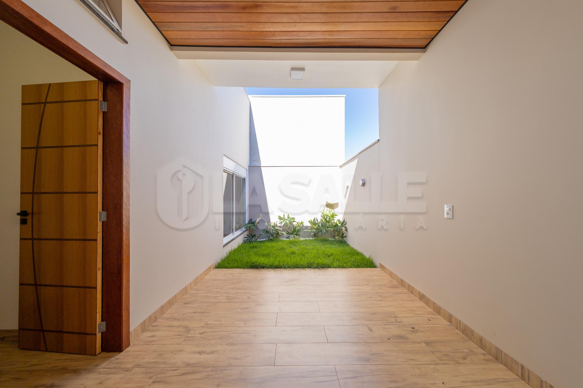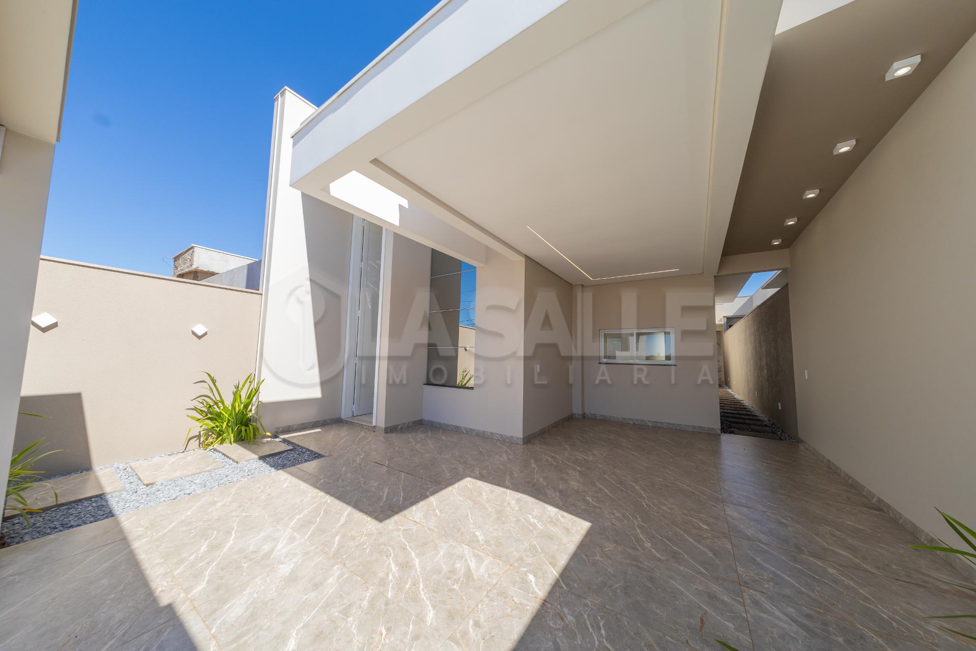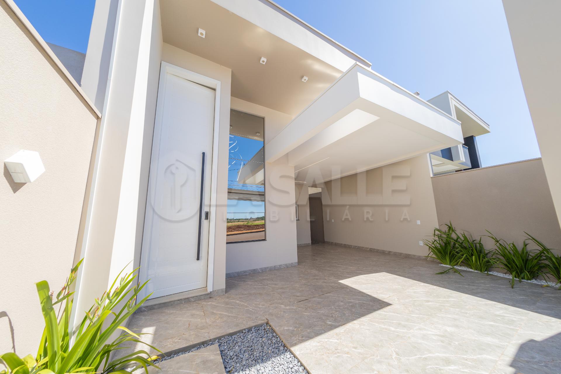 Fachada diferenciada, com design exclusivo Porta com acabamento em alumínio ripado, fechadura eletrônica e puxador amplo Possui tubulação para água quente; Iluminação em Led; Lustre na sala de estar Fachada em pele de vidro Passagem lateral, que facilita a entrada pela lavanderia e também acesso a área gourmet nos fundos com churrasqueira e lavabo; Janelas em alumínio com veneziana integrada e na suíte com acionamento elétrico. Portão da frente em rolo