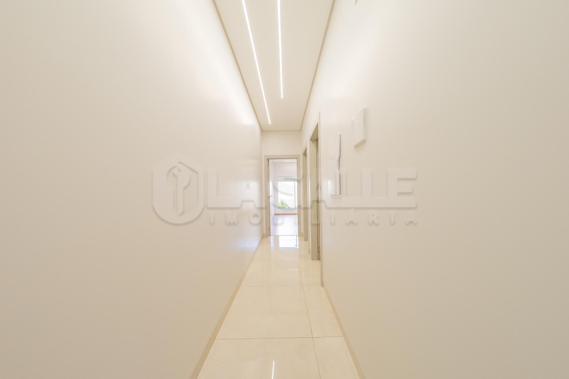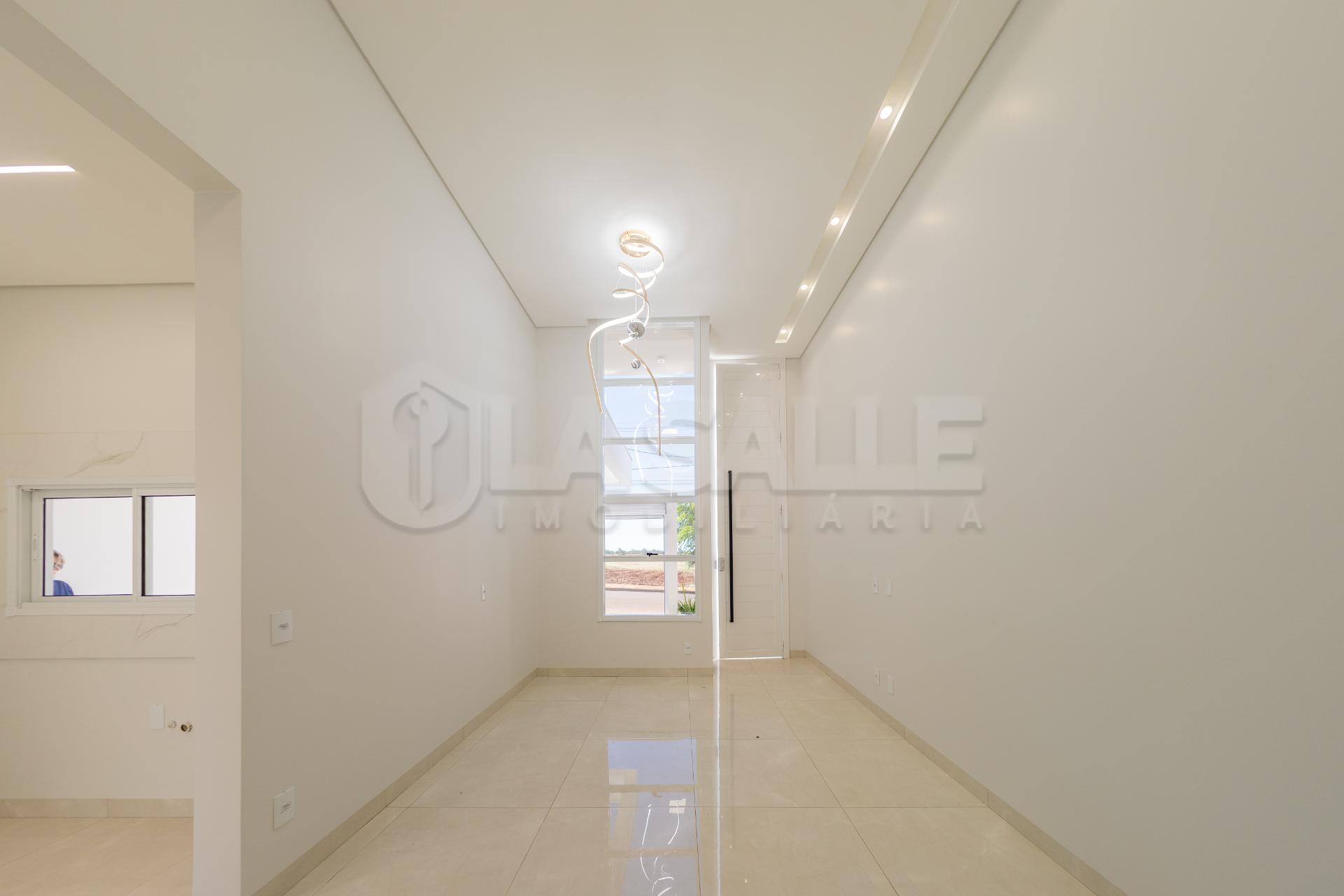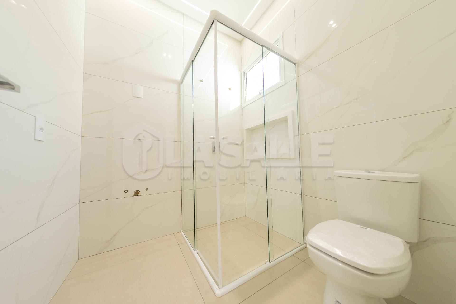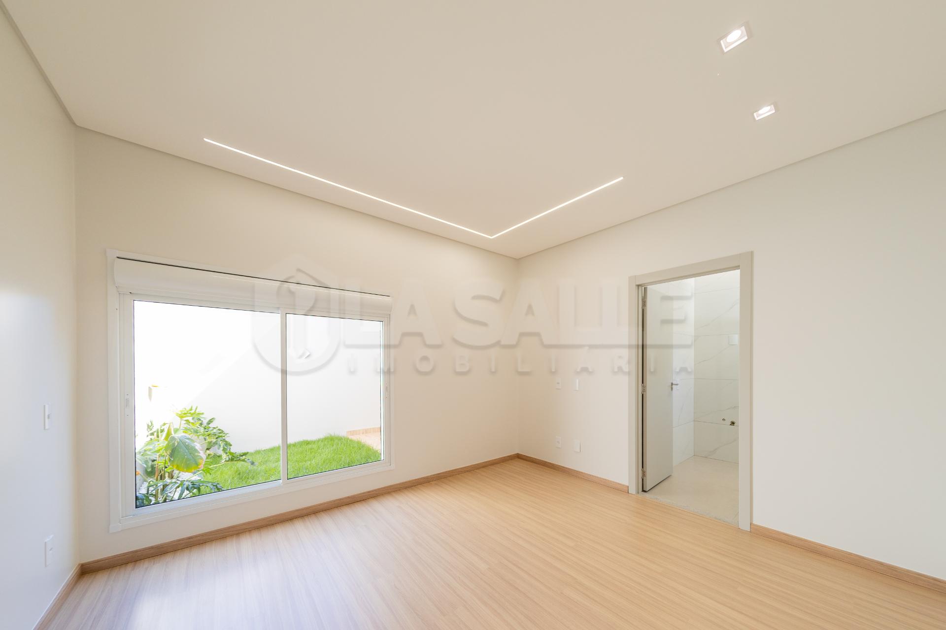 Fachada diferenciada, com design exclusivo Porta com acabamento em alumínio ripado, fechadura eletrônica e puxador amplo Possui tubulação para água quente; Iluminação em Led; Lustre na sala de estar Fachada em pele de vidro Passagem lateral, que facilita a entrada pela lavanderia e também acesso a área gourmet nos fundos com churrasqueira e lavabo; Janelas em alumínio com veneziana integrada e na suíte com acionamento elétrico. Portão da frente em rolo